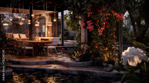 Tropical house exterior, pink flowers, blue water, night, 3d rendering