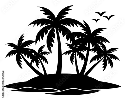tropical, island, feature, palm tree, palm tree, silhouette, vector, illustration, nature, tree, beach, summer, vacation, travel, exotic, paradise, landscape, black-and-white, isolated, design, clip art, icon, graphic, plant, foliage, frond, coast, ocean, sea, sky, white background, minimalist