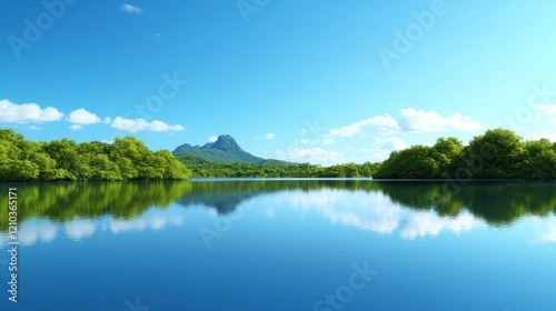 lake, mountain, island, tropical island, blue water, green tree, summer, nature, scenery, travel, vacation, paradise, idylli, peaceful, serene, calm, tranquil, relaxing, get-away, escape, environment, tropical, lush, vegetation, sky, cloud, horizon, water, mirror image, clearwater, bright, sunny, daytime, beautiful, scenic, view, panorama, photo, image