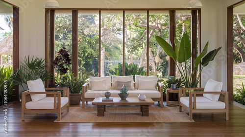 Tropical Modern living room with white sofa and chairs, wooden coffee table, and large windows overlooking a lush garden.