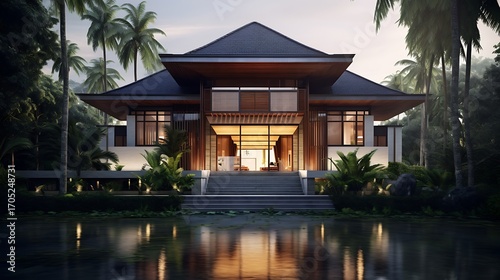 Tropical modern villa with stunning architecture reflecting on water, surrounded by lush greenery