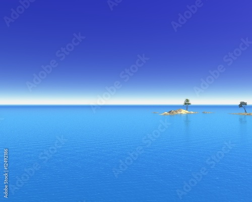 sea, ocean, water, tropical, island, sandy, sand, tree, palm, empty, deserted, peaceful, tranquil, calm, ripple, blue, gold, horizon, haze, sky, clear, bright, day, daytime, cloudless, scene, seascape, three-dimensional, render, digital, illustration