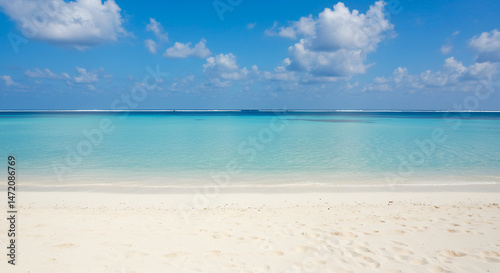 beach, ocean, sea, sand, sky, blue, water, cloud, tropical, paradise, coast, shore, calmness, vacation, holiday, tour tourism, travel, white, wave, footprint, seascape, serenity, nature, relax, clear, summer, landscape, horizon, island, turquoise, seacoast, sandy, cloudscape, sunny