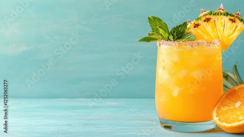 Tropical Pineapple Cocktail, Mint Garnish, Blue Background, Summer Drink Recipe