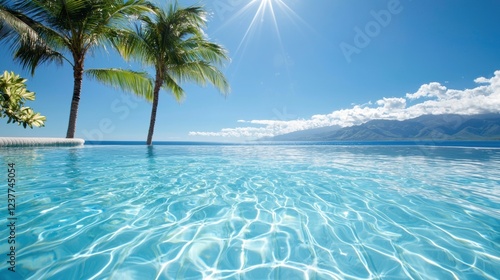 Tropical Pool Scenes Crystal clear pool surrounded by palm trees, tropical flowers, blue sky, idyllic vacation spot