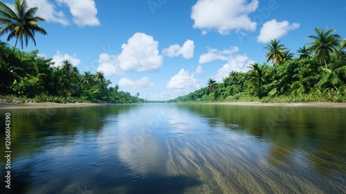 tropical, beach, river, palm tree, ocean, sand, sky, cloud, water, nature, landscape, scenery, tropical beach, calm water, summer, vacation, travel, paradise, idylli, serene, peaceful, tranquil, relaxing, get-away, tropical paradise, island, coast, shoreline, clearwater, blue skies, white cloud, green tree, sunny, bright, daytime, horizon, sunlight, beautiful, scenic, vibrant, natural, environment