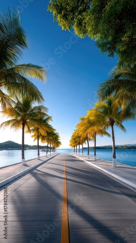 road, tropical, palm tree, ocean, sky, blue, gold, sunny, clear, path, journey, travel, scenic, landscape, nature, outdoors, coast, water, tree, lined, bright, light, sunlight, day, summer, vacation, destination, horizon, asphalt, yellow line, perspective, leading, way, beauty, serene, peaceful, tranquil, idylli, vibrant
