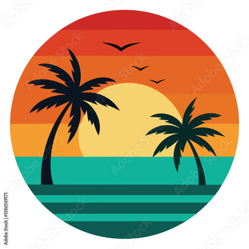 Tropical sunset scene, vibrant color palette, palm trees silhouettes, circular composition, stylized illustration, palm, beach, tree, tropical, sea, summer, sun, island, vector, ocean, sunset, illustr