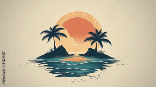 sunset, beach, island, ocean, water, landscape, palm, tree, rock, serene, nature, calmness, sky, cloud, sand, sunlight, evening, calm, artistic, illustration, minimalism, beauty, relaxation, travel, vacation, escape, paradise, warm, tropical, coast, scenery, peaceful, environment, horizon, silhouette, idylli, natural, summer, coastal, seascape, shore, vibrant, color palette, bright, scenic