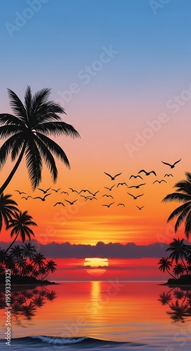 tropical, sunset, palm, tree, ocean, sea, calm, water, bird, flying, serene, peaceful, nature, landscape, travel, vacation, paradise, island, coast, beach, sun, orange, blue, sky, silhouette, relaxation, holiday
