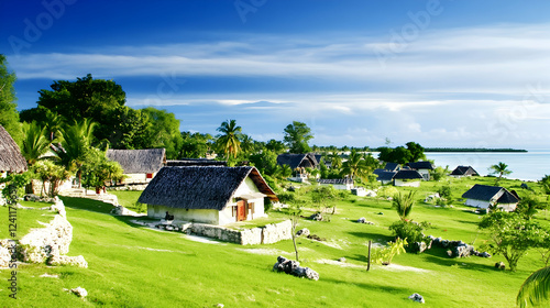 Tropical village coastal landscape, thatched huts, green hills, ocean view, tourism