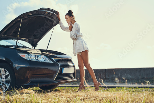 white, concerned, breakdown, engine, modern, peeking, traffic, drive, vehicle, watching, dress, outside, checking, road, lady, car, auto, bonnet, caucasian, clothes, transportation, roadside, opened, inside, outdoors, automobile, worried, adult, black, travel, inspecting, transport, trip, bankruptcy, hood, looking, person, female, driver, emergency, suppressing, tunic, repair, problem, standing, woman, beautiful, broken, roadside, trouble