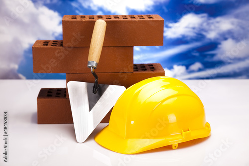 architecture, brick, build, development, bricklayer, building, business, architectural, background, hard hat, cement, colours, concept, concrete, construction, engineering, equipment, estate, home, house, industry, instrument, investment, job, made, manual, mason, new, place, structure, tool, trowel, wall, work, men at work