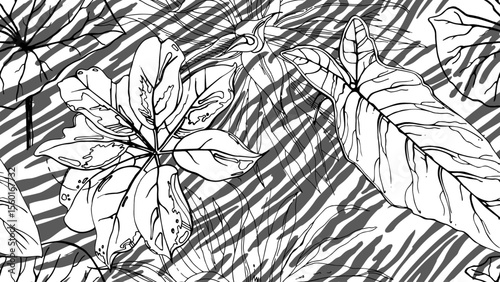 contrast, pattern, black, white, tropics, seamless, leaf, painting, trend, abstract, watercolor, plant, vignetting, print, creative, fabric, art, background, palm, artistic, brush, exotic, fashion, endless, repeat, tile, vector, design, drawing, texture, summer, geometric, graphic, textile, modern, wallpaper, beach, line, decoration, illustration, style, trendy, tropical, surface, floral, flower, contemporary, bg, stripes