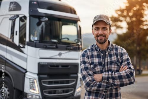 truck driver, truck, driver, transportation, logistic, trucking, portrait, man, smiling, arms crossed, confident, happy, proud, industry, freight, delivery, cargo, vehicle, professional, men at work, occupation, job, career, road, highway, travel, business, small business, success, life events, service, shipping, background, blurred background, outdoors, day, sunlight, cap, beard, caucasian, adult, one person, copy space