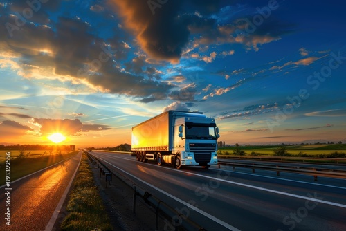 truck, transportation, highway, road, sunset, driving, travel, logistic, delivery, cargo, shipping, industry, business, freight, vehicle, transport, asphalt, speed, summer, landscape, nature, sky, cloud, sun, evening, light, gold, scenic, countryside, field, destination, journey, freedom, adventure, twilight, dusk, colourful, dramatic, beautiful, idylli, peaceful, serene, background, copy space, no people, editorial