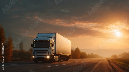 Truck Driving on Open Road at Beautiful Sunrise with Clouds