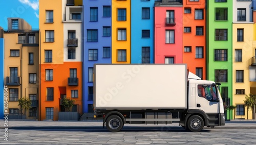 Truck Parked in Front of Multicolored Buildings with Advertising Space