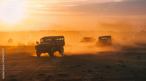 Trucks traverse a sunlit desert, their silhouettes emerging through the swirling dust, evoking adventure and resilience under the golden sky.