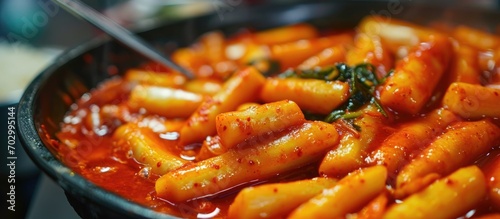 Tteokbokki is a popular street food made from spicy Korean rice cake cooked with gochujang.