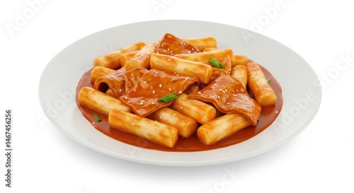 Tteokbokki with Rice Cakes and Sauce on White Plate