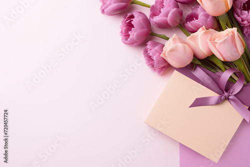 Tulip Purple Flowers on Table White Background: Mother's Day Postcard Message Greeting Card for Wedding, Anniversary, Valentine's Day