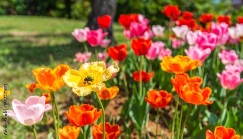 tulip, flower, spring, meadow, bloom, floral, garden, nature, colourful, vibrant, bright, red, pink, yellow, orange, green, field, sunny, sunlight, daylight, outdoors, flora, stem, leaf, plant, botany, botanical, springtime, growth, beauty, beautiful, fresh, closeup, macro, detail, landscape, scene, environment, season, seasonal, countryside, rural, scenic, wildflower, wildflower, bee, insect