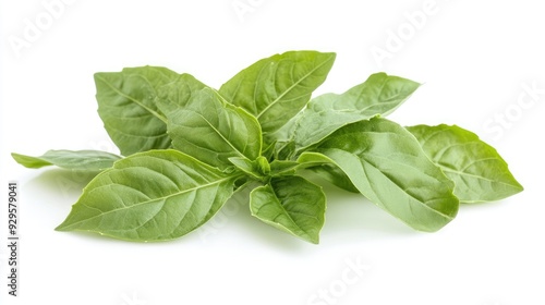 Tulsi (holy basil) leaves isolated on a white background, emphasizing their bright green color and traditional significance in health and wellness.