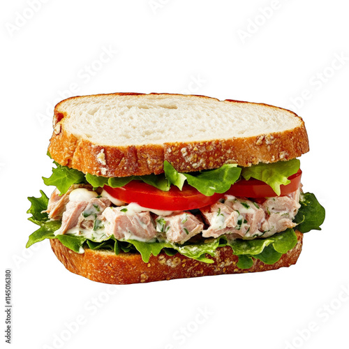 Tuna salad sandwich with lettuce tomato and mayonnaise on whole wheat bread isolated on white background healthy meal quick lunch snack food delicious fresh homemade sandwich cut out clipping path