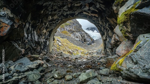 glacier, mountain, tunnel, rock, stone, arch, nature, landscape, scenery, view, travel, adventure, exploration, geology, wilderness, environment, pathway, opening, passage, light, shadow, green, moss, grey, dark, cold, rough, texture, rugged, scenic, vista, perspective, horizon, vale, hill, peak, cliff, stone, ground, earth, scene, image, photo, photo