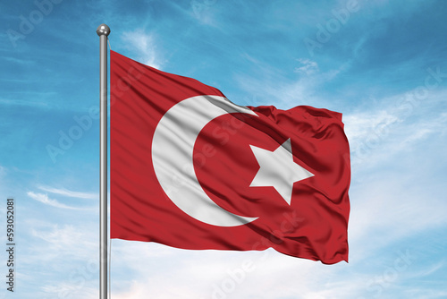 Turkey national flag cloth fabric waving on beautiful sky Background.