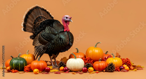 thanksgiving, turkey, wild, bird, harvest, autumn, fall, pumpkin, leaf, foliage, animal, poultry, holiday, celebration, festive, orange, green, brown, apple, berry, pine cone, seasonal, background, copy space, wildlife, farming, bounty, abundance, november, studio, shot, isolated, portrait, still life, happy, scene, national, card, thank, thankful, invitation, give, thank, grateful, no people, banner, composition, arrangement