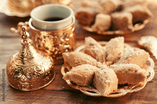 Turkish sweets with coffee on a wooden table