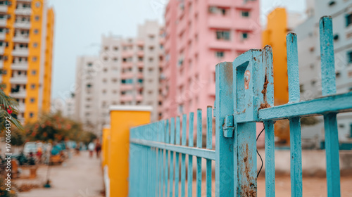 fence, apartment, building, residential, gate, turquoise, pastel, pink, yellow, facades, urban, city, shallow, depth, field, railing, metal, entrance, complex, condominium, exterior, architecture, high, rise, colourful