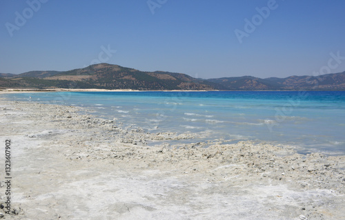 Turquoise Lake Shore with Mountains Under Blue Sky