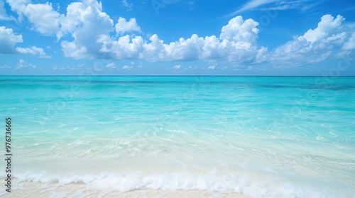 Turquoise ocean waves and white sandy beach under a blue sky. Tropical paradise photography for design and print.