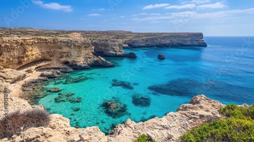 sea, ocean, coast, cliff, rock, turquoise, water, blue, sky, sunny, summer, landscape, beach, mediterranean, shore, island, calm, clear, tranquil, view, scenic, beautiful, natural, paradise, vacation, travel, holiday, sunlight, wave, horizon, coastline, cape, ecology, nature, environment, seaweed, flora, fauna, sand, sun