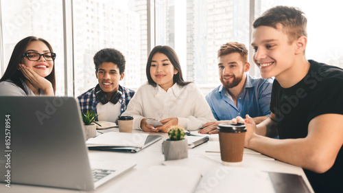 Tutorial video. Students using laptop in university library, looking at screen together, panorama