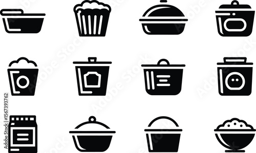 container, icon, black, white, set, collection, symbol, design element, graphic, illustration, kitchen utensile, cooking, popcorn, bucket, pot, bowl, cardboard box, monochrome, simple, minimalist, clip art, silhouette, utensil, tableware, graphic, digital, download, printable, template, element, signs