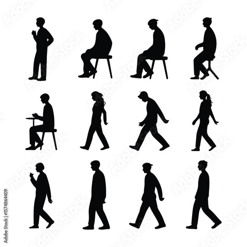 silhouette, people, man, woman, walking, sitting, standing, pose, black-and-white, graphic, illustration, isolated, white background, figure, male, female, casual attire, formal, movement, activity, collection, set, group, diverse, simple, clean