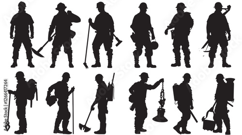men at work, men at work, silhouette, silhouette, man, man, people, person, person, tool, tool, equipment, industry, hard hat, helmet, hat, construction, labor, job, job, occupation, profession, manual, working, employment, service, team, group, crew, uniform, gear, safety, hard, work, task, effort, activity, action, black, white, graphic, design, illustration, image, picture, set, collection