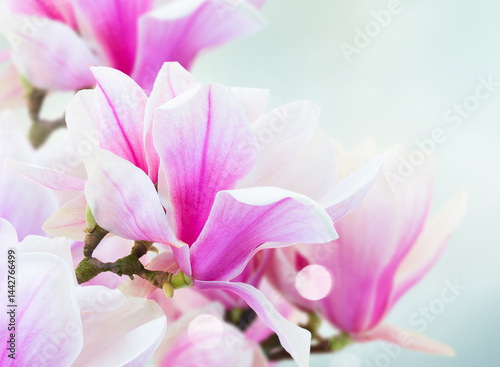twig with blooming pink magnolia flowers close up over blue background