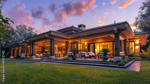 Twilight capture of a luxury estate radiant inside lighting chic patio and pristine yard.