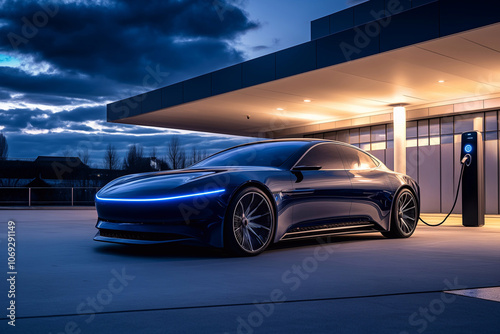 Twilight Recharge: Futuristic Blue Electric Sports Car at Urban Charging Hub.