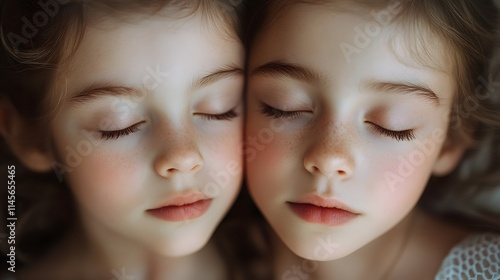 girl, twin, sleeping, eye, closed, face, skin, freckle, cheek, lip, nose, hair, brown, light, soft, gentle, peaceful, serene, quiet, calm, tender, delicate, beautiful, innocence, childhood, youth, portrait, close, up, together, bonding, love, sister, family, adorable, precious, sweet, dreamy, angelic, purity