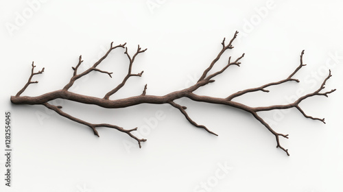 Twisted Branch with Detailed Twigs and Textured Bark on White Background