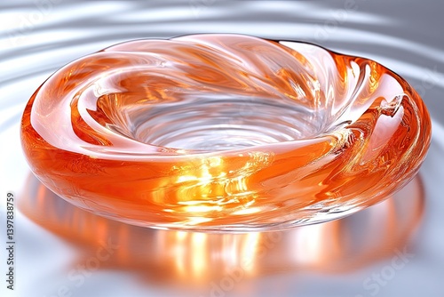 Twisted, polished glass donut. Reflection on shiny, rippled surface. Orange light