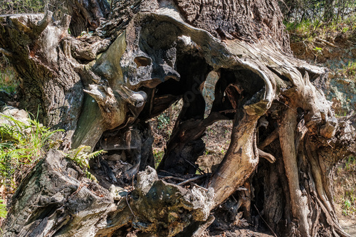 Twisted roots and stump of oak tree in Corsica
