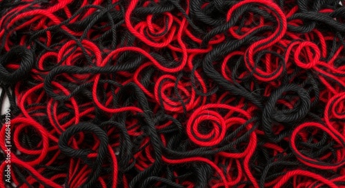 Twisted, swirling, messy pile of black and red yarn, background pattern