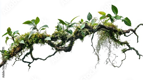 Twisted wild liana messy jungle vines plant with moss, lichen and wild climbing orchid leaves on white background